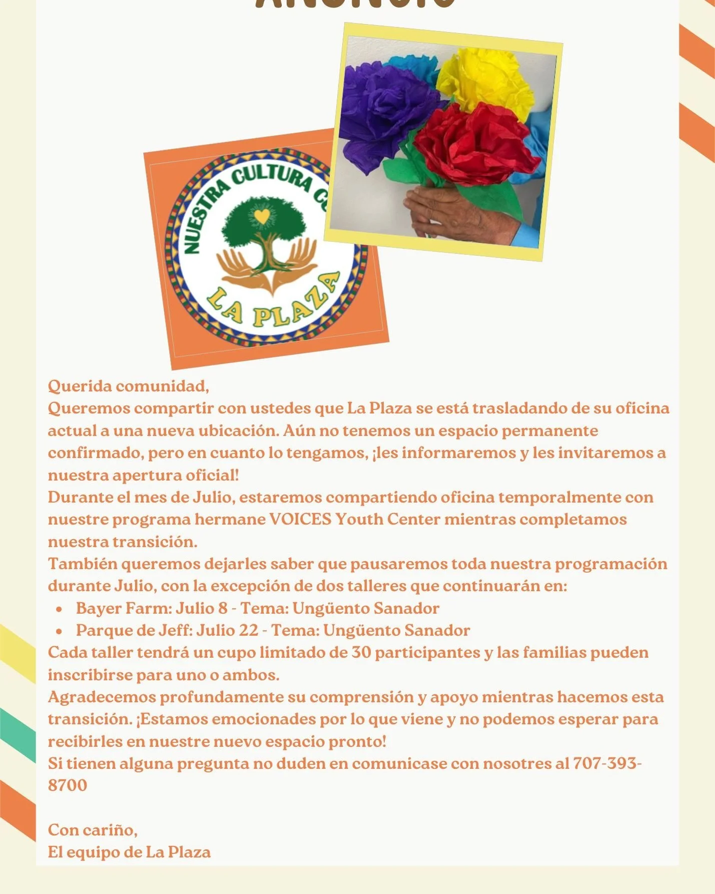 Si es residente del condado de Sonoma y necesita apoyo o recursos, tiene interés en asistir a nuestros talleres y clases, o simplemente desea obtener más información sobre nuestra comunidad, ¡esperamos tener noticias suyas! Comuníquese con nosotros por teléfono, correo electrónico o visítenos durante el horario de oficina de nuestro centro.